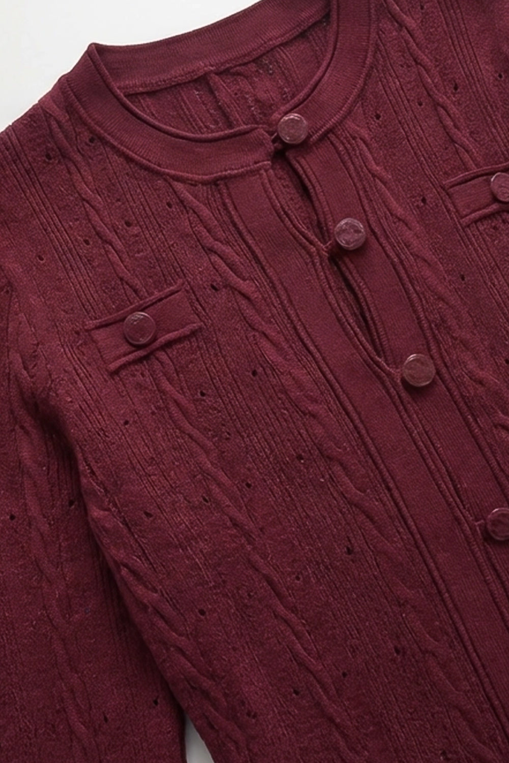 Burgundy Knit Button-Front Midi Dress with Pointelle Detailing