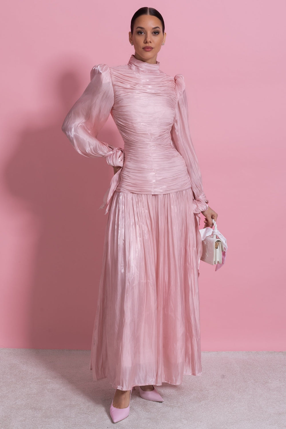 Blush Pink Ruched Long Sleeve Maxi Dress With Pleated Skirt