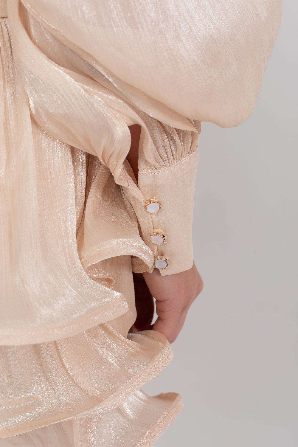Button-front placket with rose-style gold buttons