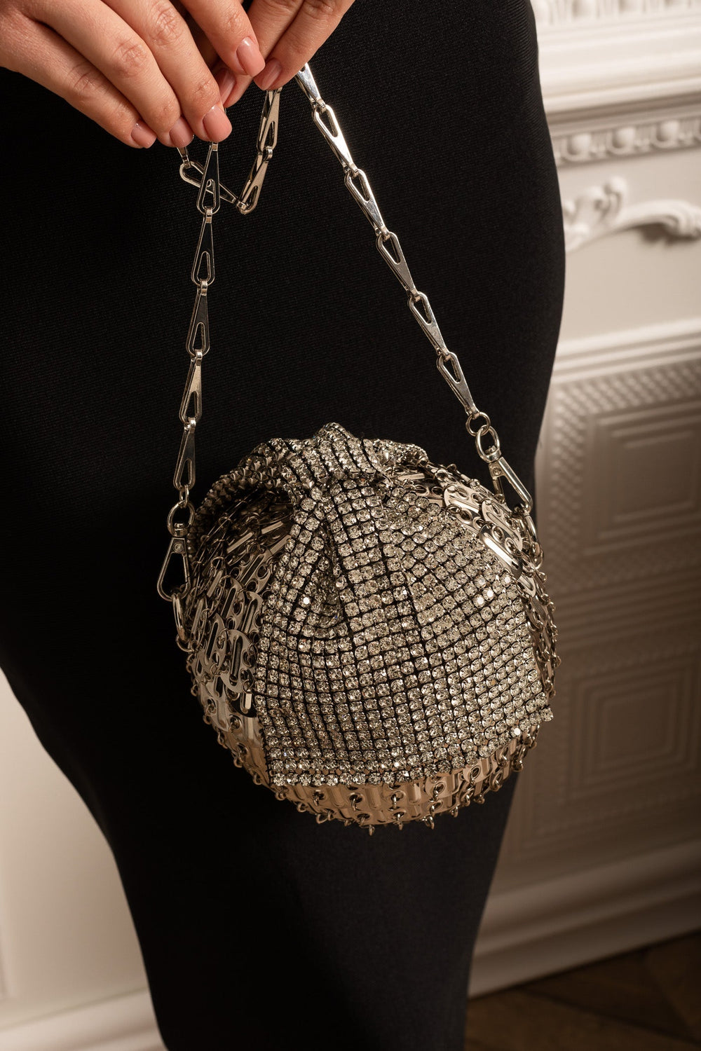 Silver Spherical Metallic Handbag With Shimmering Embellishments
