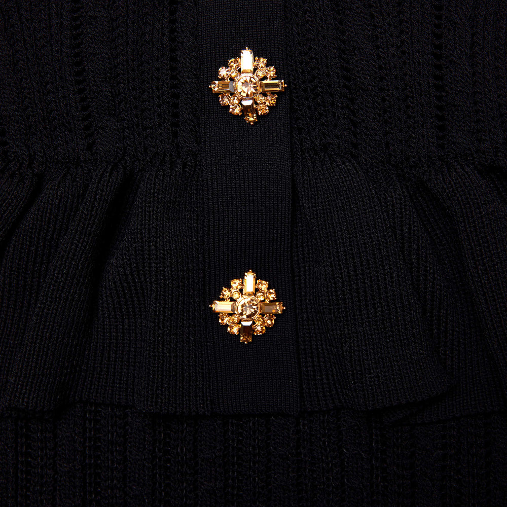 The one-and-done option for every occasion, this midi dress is cut from black pointelle knit. A peplum waist detailing flatters the form – match its gold buttons with our statement earrings.