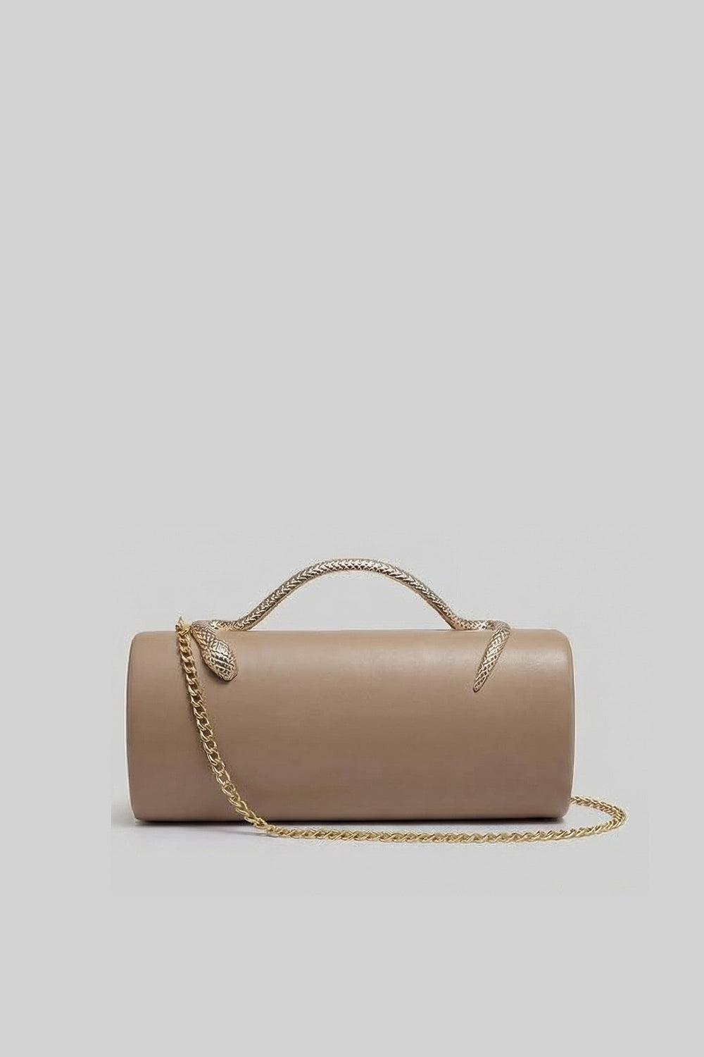 Khaki Structured Clutch Bag with Snake Handle And Gold Chain