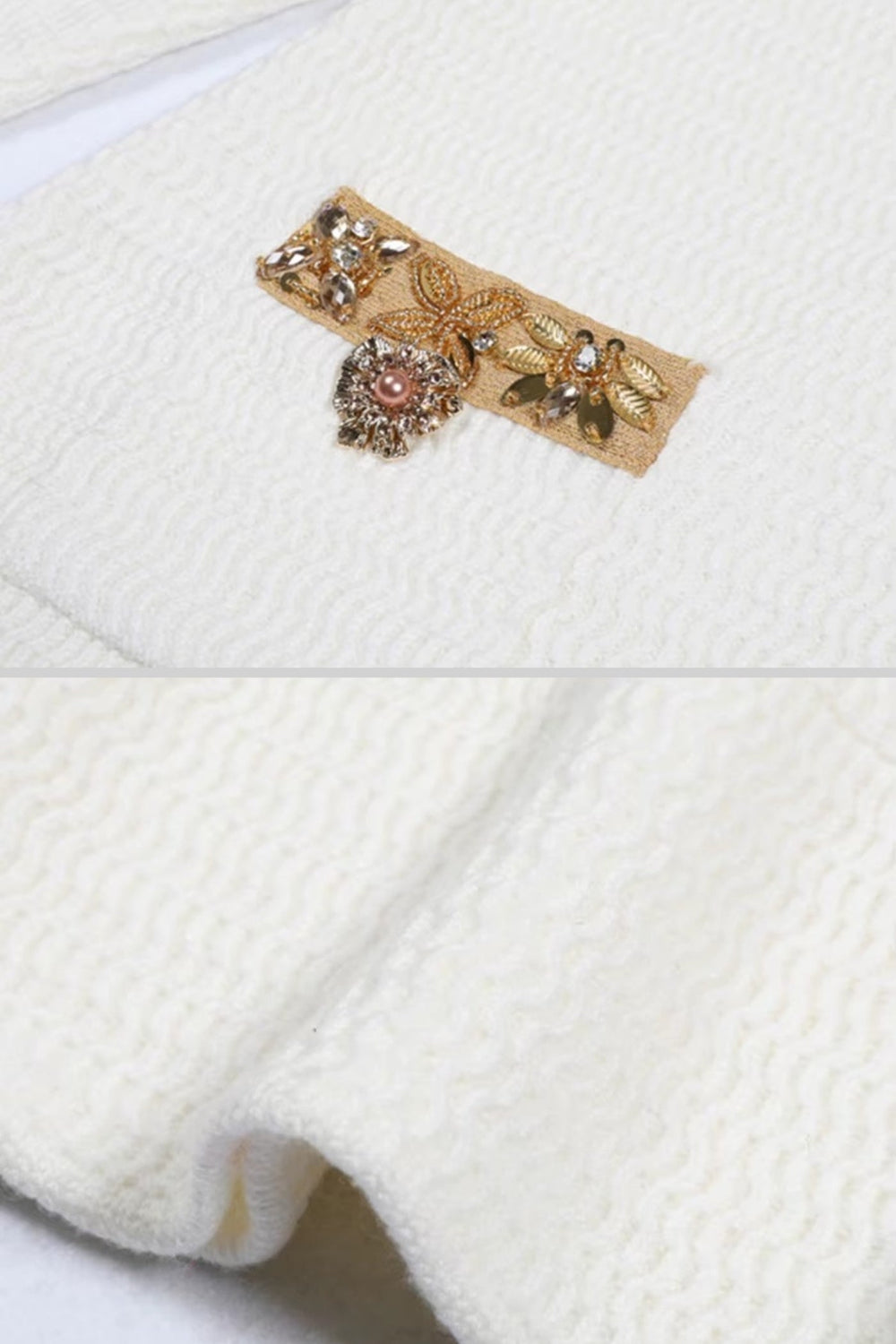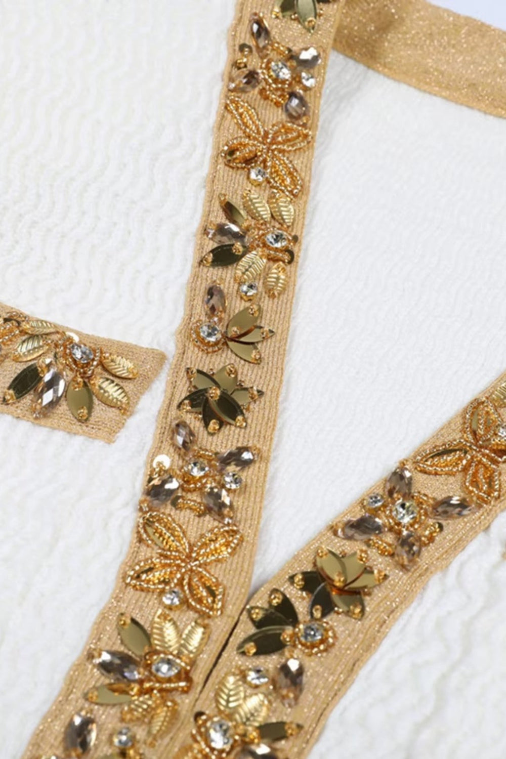 White Textured Mini Dress With Long Sleeves And Gold Detailing