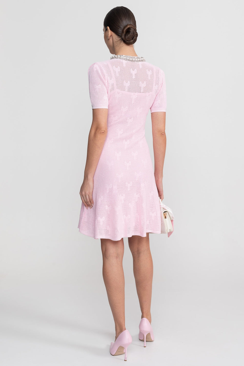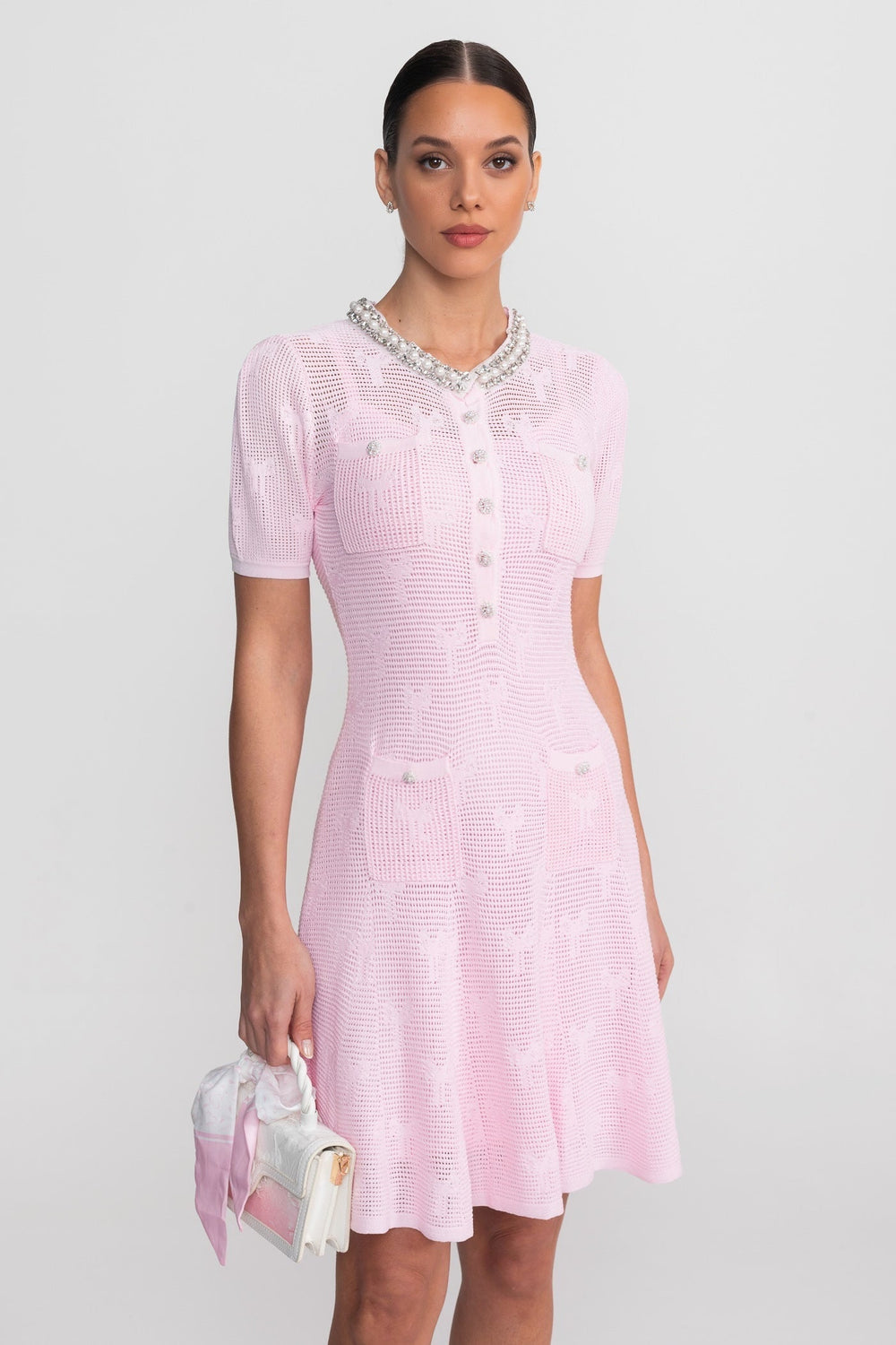 Pink Textured Short Sleeve Mini Dress With Pearl-Trim Neckline And Crystal Buttons