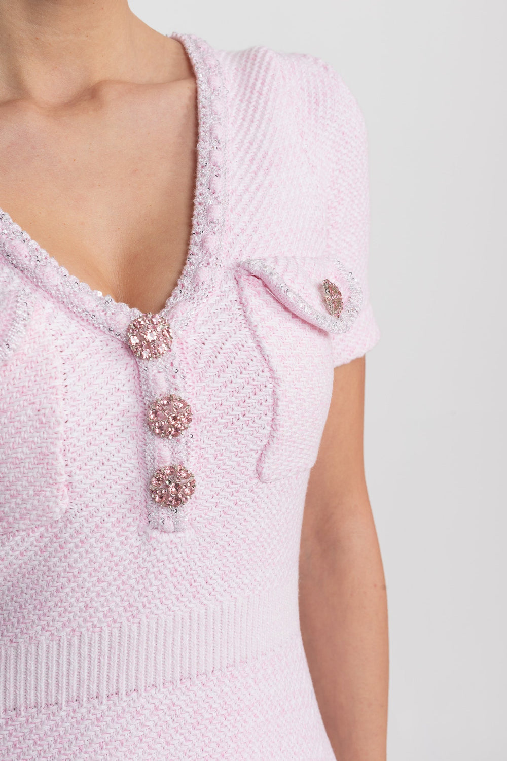 Pink Textured Short Sleeve Mini Dress With V-Neckline And Jewel Buttons